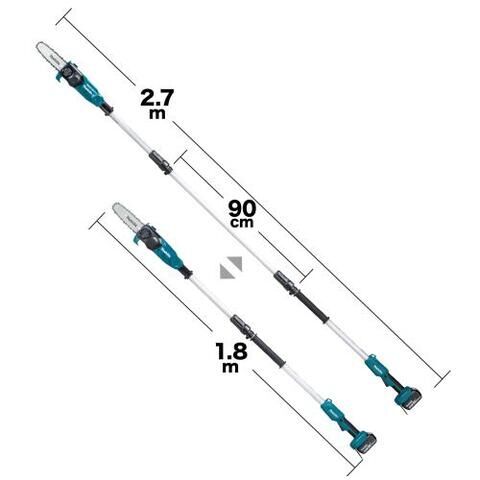 高さに応じて、シャフトを差し替えることで、「最大作業高さ約3.5m(製品全長約2.7m)のロングモード」と、「作業高さ約2.5m(製品全長約1.8m)のショートモード」の2段階に長さ調整可能。(※BL1860B使用時、チェーン刃、ガイドバー含む。)