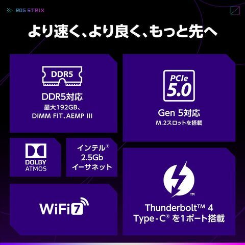 ◆豊富な接続性:1 × M.2 Gen5、Thunderbolt 4、USB 20Gbps Type-C、フロント10Gbps Type-C、PCIe 5.0 x16 SafeSlot