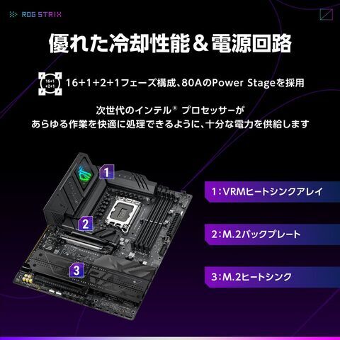◆最適化された熱設計:VRM ヒートシンクアレイ、ヒートシンク付きM.2スロット、M.2 バックプレート