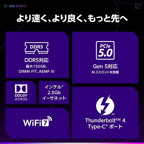 ◆豊富な接続性:1 × M.2 Gen5、Thunderbolt 4、USB 20Gbps Type-C、フロント10Gbps Type-C、PCIe 5.0 x16 SafeSlot