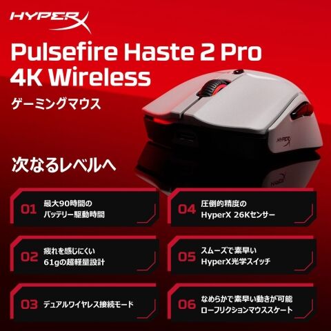 HyperX Pulsefire Haste 2 Pro 4K Wirelessゲーミングマウスは、 2.4GHzの無線接続環境で追加オプションなしに1秒間に4000回という驚異的な頻度でマウスの位置情報をPCに送信できる4Kポーリングレートをサポートします。