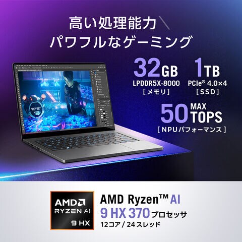 - CPU(AI機能) : AMD Ryzen AI (NPU パフォーマンス 最大 50 TOPS)
