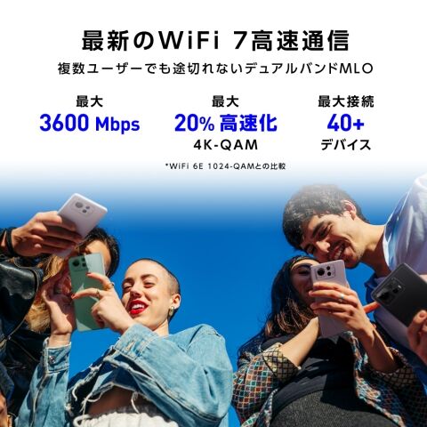 - データ帯域:2.4GHz:最大 688 Mbps(WiFi 7)/5GHz:最大 2882 Mbps(WiFi 7)