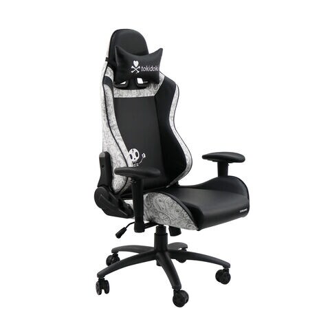 ヘッドレストにtokidokiのロゴ、背もたれのドクロがかわいいゲーミングチェア。前面のサイド部分と背面にはtokidokiならではのキャラクターデザインプリントが配され、モノトーンカラーにより落ち着いた仕上がりになっています。
