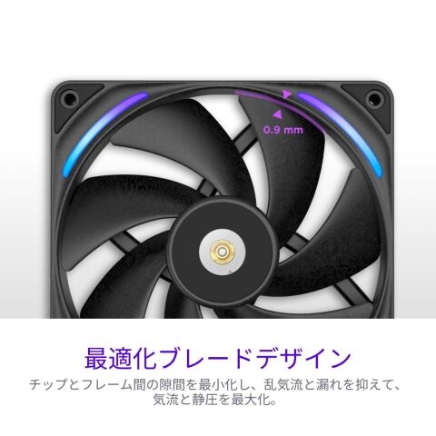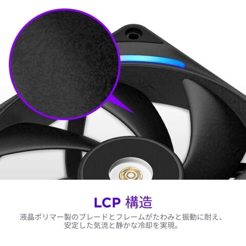 液晶ポリマー(LCP)素材を採用。高回転時の歪みを抑え、従来比で静音性を維持しつつ風量・静圧を向上。