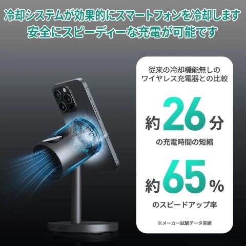 Qi2対応iPhoneシリーズなどの機器の急速ワイヤレス充電が可能です。外出前に電池残量が少ないことに気付いた時でもスピーディーに充電が進みます。