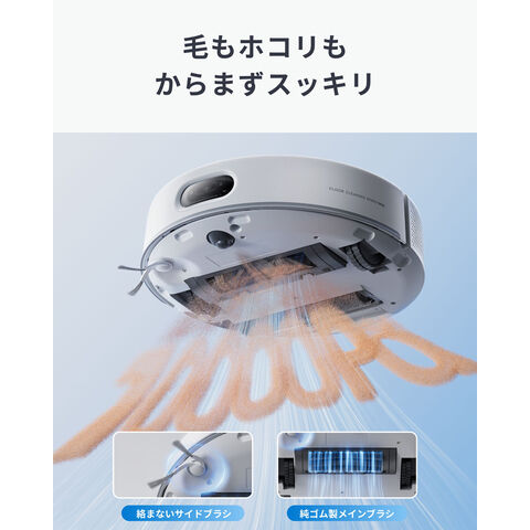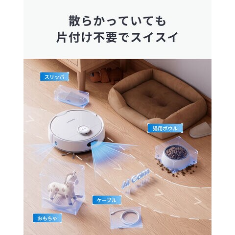 AIカメラと距離センサーを組み合わせ、電源コードやペットの排泄物、靴などを認識し回避します。