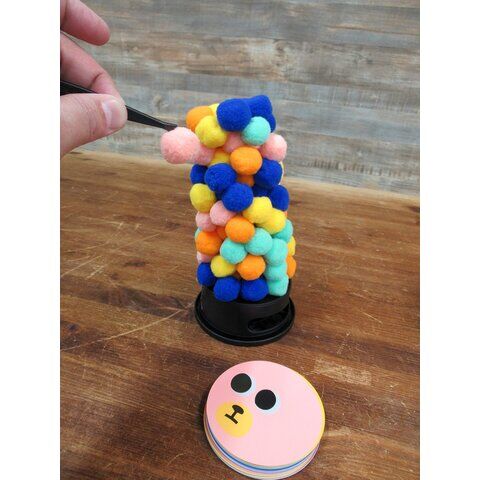 手番プレイヤーはカードを1枚引き、引いたカードと同じ色の毛玉を、ピンセットか指を使って塔から取り、取った毛玉や他の毛玉を落とさないように、塔の元あった場所よりも高いところに置き(くっつけ)ます。