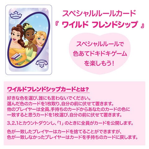 各カードには、シンデレラ、ジャスミン、ティアナなど、お気に入りのディズニープリンセスのキャラクターが描かれており、スペシャルルールの「ワイルド フレンドシップ」は、選ばれた色と一致すれば、他のプレイヤーに捨て札のチャンスを与えるカードです。