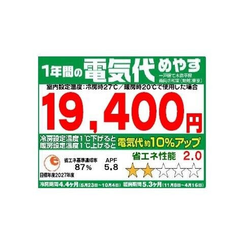 ・冷房時:580W (最小値190W~最大値820W) - 年間電気代目安:19400円