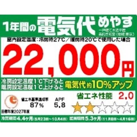 ・冷房時:640W (最小値140W~最大値870W) - 年間電気代目安:22000円