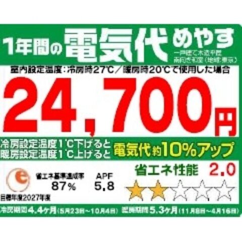 ※製品を1年間(冷暖房期間中において1日に18時間)使用した場合の目安電気料金となります。(電力料金目安単価27円/kWhにて算出)