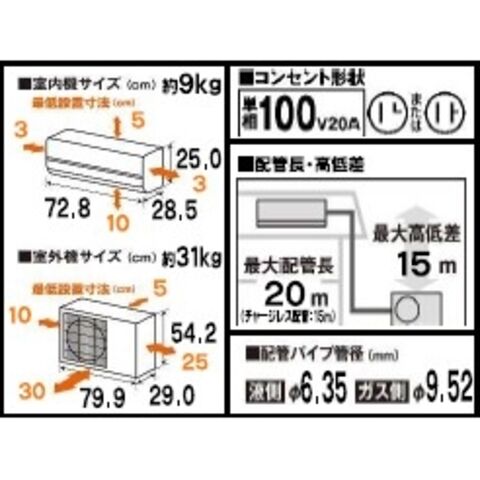 ・室外機:31kg - 最大配管長:20m (15mを越える場合は冷媒の補充が必要です)
