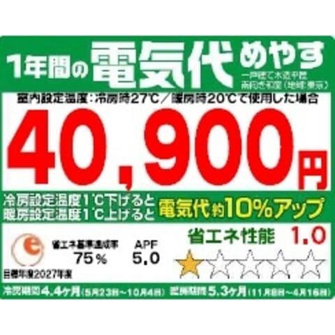 ・冷房時:1350W (最小値150W~最大値1500W) - 年間電気代目安:40900円
