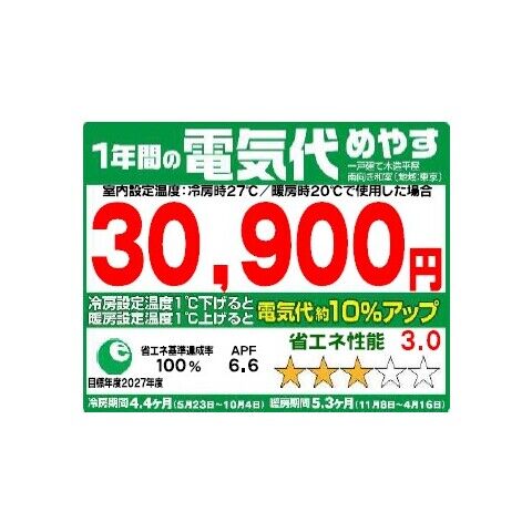 ・冷房時:890W (最小値140W~最大値1700W) - 年間電気代目安:30900円