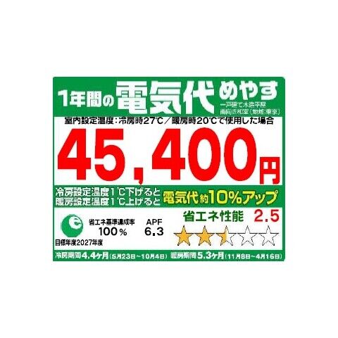 ・冷房時:1530W (最小値110W~最大値1850W) - 年間電気代目安:45400円