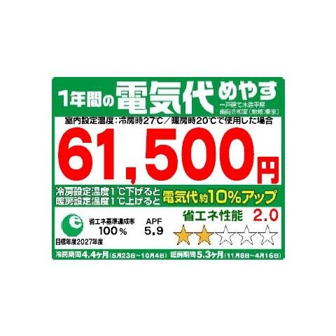 ・冷房時:2330W (最小値120W~最大値2700W) - 年間電気代目安:61500円