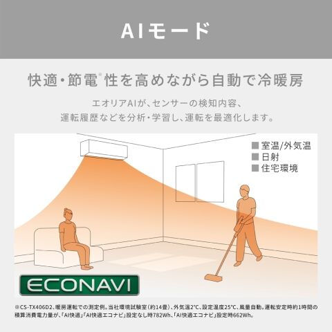 快適・節電性を高めながら自動で冷暖房。エオリアAIが、センサーの検知内容、運転履歴などを分析・学習し、運転を最適化します。