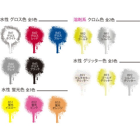 - 用途(支持体):紙、石、キャンバス、金属、プラスティック、ガラス、コルク、焼成粘土、セラミック、石膏、木、ドライフラワー、アーティフィシャルフラワー