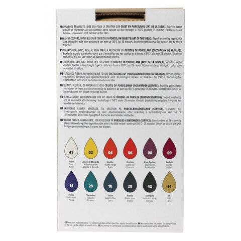 • セット内容:20mlボトル×12色(43アイボリー、02マルセイユイエロー、04アガトオレンジ、06スカーレットレッド、08オーパラインピンク、09フクシア、14パルマバイオレット、20ターコイズ、18サファイアブルー、28ブロンズグリーン、42アンスラサイトブラック、44ゴールド