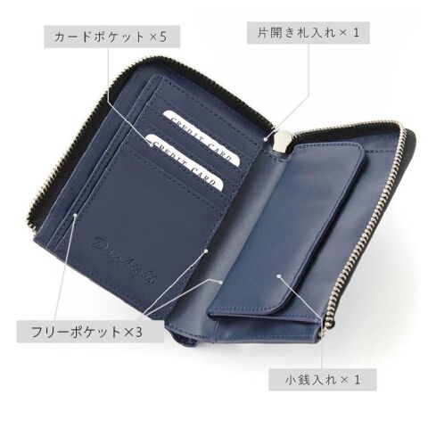 L字型ファスナーをサッと引き上げて開くだけでお財布の中がひと目で把握できる、実用性を重視したつくり。