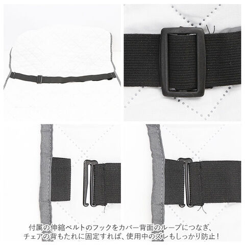 ◆付属の伸縮ベルトのフックをカバー背面のループにつなぎ、チェアの背もたれに固定すれば、使用中のズレもしっかり防止!