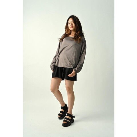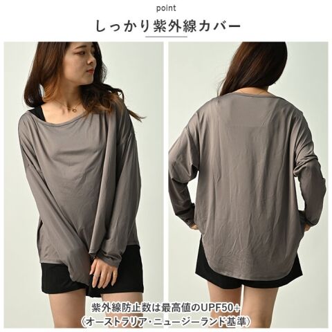 トップスはゆったり感のあるオフショルタイプ。後ろ丈が長めのデザインで、腰回りをカバー。フィンガーホール付きで手の甲までしっかり日焼け対策。