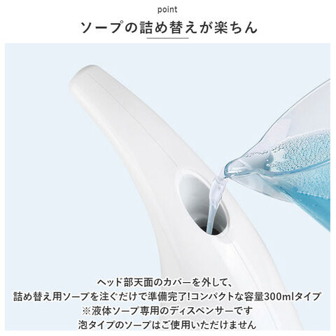 ヘッド部天面のカバーを外して、詰め替え用ソープを注ぐだけで準備完了! コンパクトな容量300mlタイプ。(※液体ソープ専用のディスペンサーです。泡タイプのソープはご使用いただけません。)