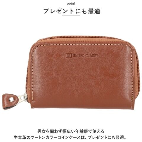 男女を問わず幅広い年齢層で使える牛本革のツートンカラーコインケースは、プレゼントにも最適。