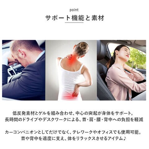低反発素材とゲルを組み合わせ、中心の突起が身体をサポート。長時間のドライブやデスクワークによる、首・肩・腰・背中への負担を軽減。