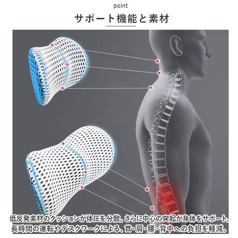 低反発素材のクッションが体圧を分散。さらに中心の突起が身体をサポート。長時間の運転やデスクワークによる、首・肩・腰・背中への負担を軽減。