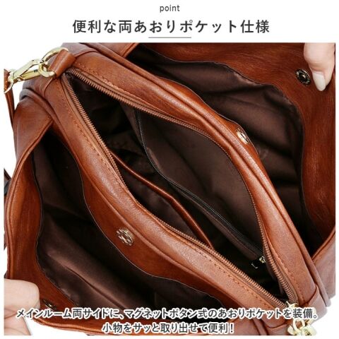 メインルーム両サイドに、マグネットボタン式のあおりポケットを装備。小物をサッと取り出せて便利!