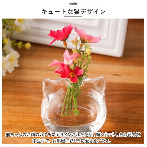 猫ちゃんのお顔のカタチにデザインされた花瓶。短くカットしたお花を数本生けて、お部屋に彩りと可愛さをプラス。