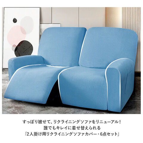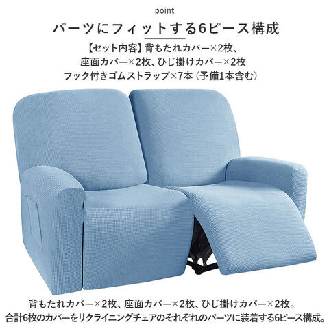 背もたれカバー×2枚、座面カバー×2枚、ひじ掛けカバー×2枚。合計6枚のカバーをリクライニングチェアのそれぞれのパーツに装着する6ピース構成。