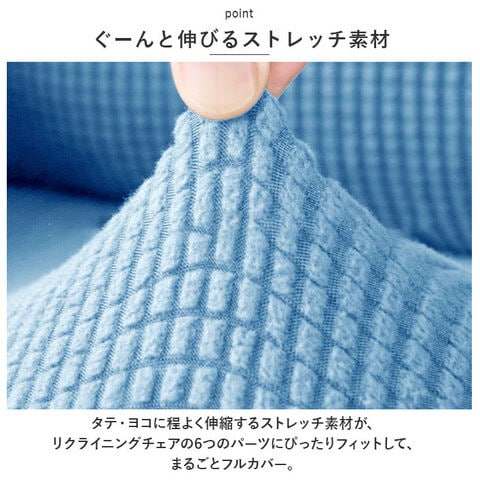 タテ・ヨコに程よく伸縮するストレッチ素材が、リクライニングチェアの6つのパーツにぴったりフィットして、まるごとフルカバー。