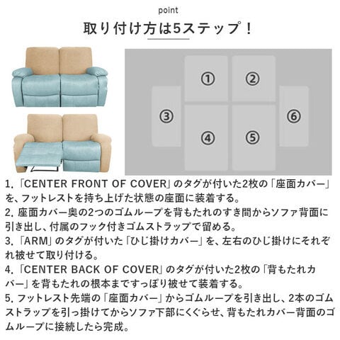 - 注意書き:【取り付け方は5ステップ! 】1.「CENTER FRONT OF COVER」のタグが付いた2枚の「座面カバー」を、フットレストを持ち上げた状態の座面に装着する。2.座面カバー奥の2つのゴムループを背もたれのすき間からソファ背面に引き出し、付属のフック付きゴムストラップで留める。3.「ARM」のタグが付いた「ひじ掛けカバー」を、左右のひじ掛けにそれぞれ被せて取り付ける。4.「CENTER BACK OF COVER」のタグが付いた2枚の「背もたれカバー」を背もたれの根本まですっぽり被せて装着する。5.フットレスト先端の「座面カバー」からゴムループを引き出し、2本のゴムストラップを引っ掛けてからソファ下部にくぐらせ、背もたれカバー背面のゴムループに接続したら完成。海外輸入品のため、商品によってはパッケージや説明書が、英語や中国語表記となっている場合があります。商品を安価でご提供させていただくため、輸入時のパッケージのままでのお届けとなります。予めご了承くださいませ。商品の写真はできる限り実物のお色に近づけるように加工しておりますが、お使いのモニター設定、お部屋の照明などにより、実際の商品と異なる場合がございます。商品の生産時期などにより、付属品(ボタン、ファスナー、タグ、パッケージなど)のデザインや仕様の一部が変更になる場合がございますが、予めご了承くださいませ。商品や個体差などにより、表記と若干異なる場合がございますが、予めご了承くださいませ。輸入品のため、糸の継ぎ目や縫製等が甘い部分、糊跡等が生じる場合がございますが、予めご了承くださいませ。生地の特性上、やや匂いが強く感じられるものもございます。数日のご使用や陰干しなどで気になる匂いはほとんど感じられなくなります。お手入れなどはタグなどの表記をご確認ください。配送の方法によっては、商品に多少のシワ等ができる場合がございますが、出来る限りお客様にリーズナブルな価格帯でご提供するためです。ご了承くださいませ。採寸方法の違いにより、多少の誤差がある場合がございます。