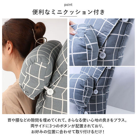 背もたれ用のクッション、座布団、膝上のクッションテーブル代わりに。お昼寝用の枕代わりや、うつぶせ寝のクッションとしても活躍。ミニクションは抱き枕に。