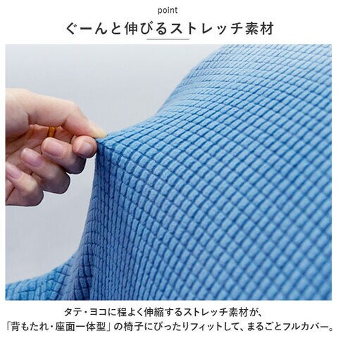 タテ・ヨコに程よく伸縮するストレッチ素材が、「背もたれ・座面一体型」の椅子にぴったりフィットして、まるごとフルカバー。
