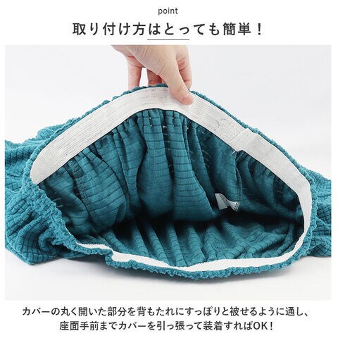 カバーの丸く開いた部分を背もたれにすっぽりと被せるように通し、座面手前までカバーを引っ張って装着すればOK!