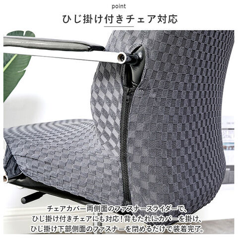 チェアカバー両側面のファスナースライダーで、ひじ掛け付きチェアにも対応! 背もたれにカバーを掛け、ひじ掛け下部側面のファスナーを閉めるだけで装着完了。