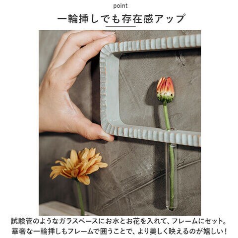試験管のようなガラスベースにお水とお花を入れて、フレームにセット。華奢な一輪挿しもフレームで囲うことで、より美しく映えるのが嬉しい!
