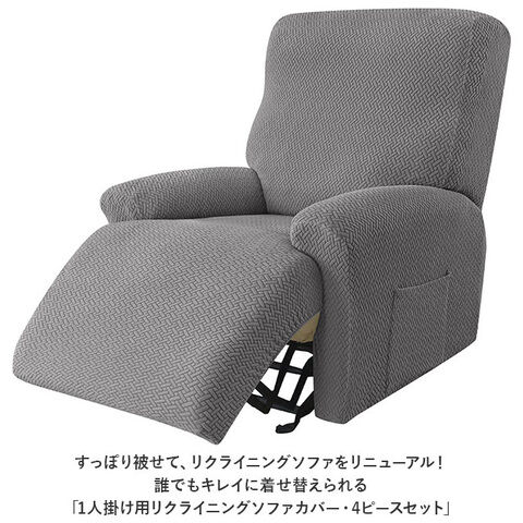背もたれカバー×1枚、座面カバー×1枚、ひじ掛けカバー×2枚。合計4枚のカバーをリクライニングチェアのそれぞれのパーツに装着する4ピース構成。