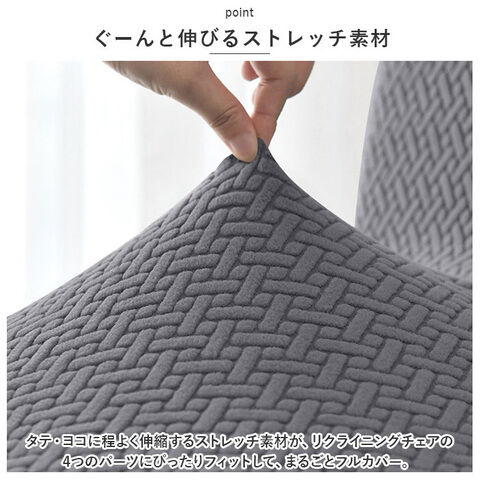 タテ・ヨコに程よく伸縮するストレッチ素材が、リクライニングチェアの4つのパーツにぴったりフィットして、まるごとフルカバー。