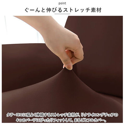 タテ・ヨコに程よく伸縮するストレッチ素材が、リクライニングチェアの4つのパーツにぴったりフィットして、まるごとフルカバー。