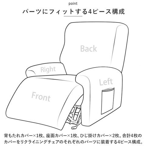 背もたれカバー×1枚、座面カバー×1枚、ひじ掛けカバー×2枚。合計4枚のカバーをリクライニングチェアのそれぞれのパーツに装着する4ピース構成。