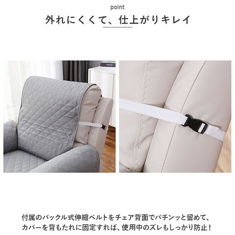 付属のバックル式伸縮ベルトをチェア背面でパチンッと留めて、カバーを背もたれに固定すれば、使用中のズレもしっかり防止!