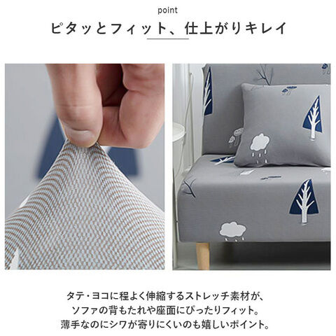 タテ・ヨコに程よく伸縮するストレッチ素材が、ソファの背もたれや座面にぴったりフィット。薄手なのにシワが寄りにくいのも嬉しいポイント。