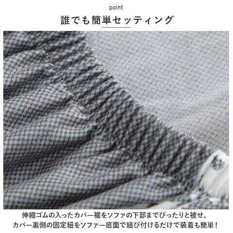 伸縮ゴムの入ったカバー裾をソファの下部までぴったりと被せ、カバー裏側の固定紐をソファー底面で結び付けるだけで装着も簡単!
