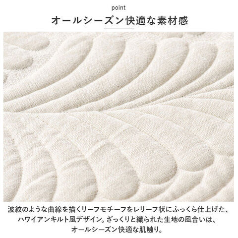 波紋のような曲線を描くリーフモチーフをレリーフ状にふっくら仕上げた、ハワイアンキルト風デザイン。ざっくりと織られた生地の風合いは、オールシーズン快適な肌触り。