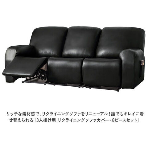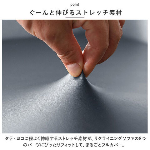 タテ・ヨコに程よく伸縮するストレッチ素材が、リクライニングソファの8つのパーツにぴったりフィットして、まるごとフルカバー。